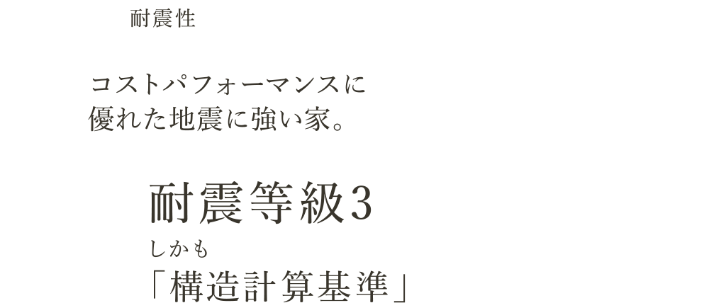 通常の木造2階建の住宅では、構造計算が義務付けられておらず安全性に対し根拠がない建物も存在します。ですが「耐久の家」は柱などの構造材を1本1本、強度の計算を行うことで安全性を確実なものにしています。しかも計算の基準は木構造における最も厳しい基準「耐震等級3」で計算しており、これは震度6強〜7の地震でも、軽い補修で住み続けられるレベルです。